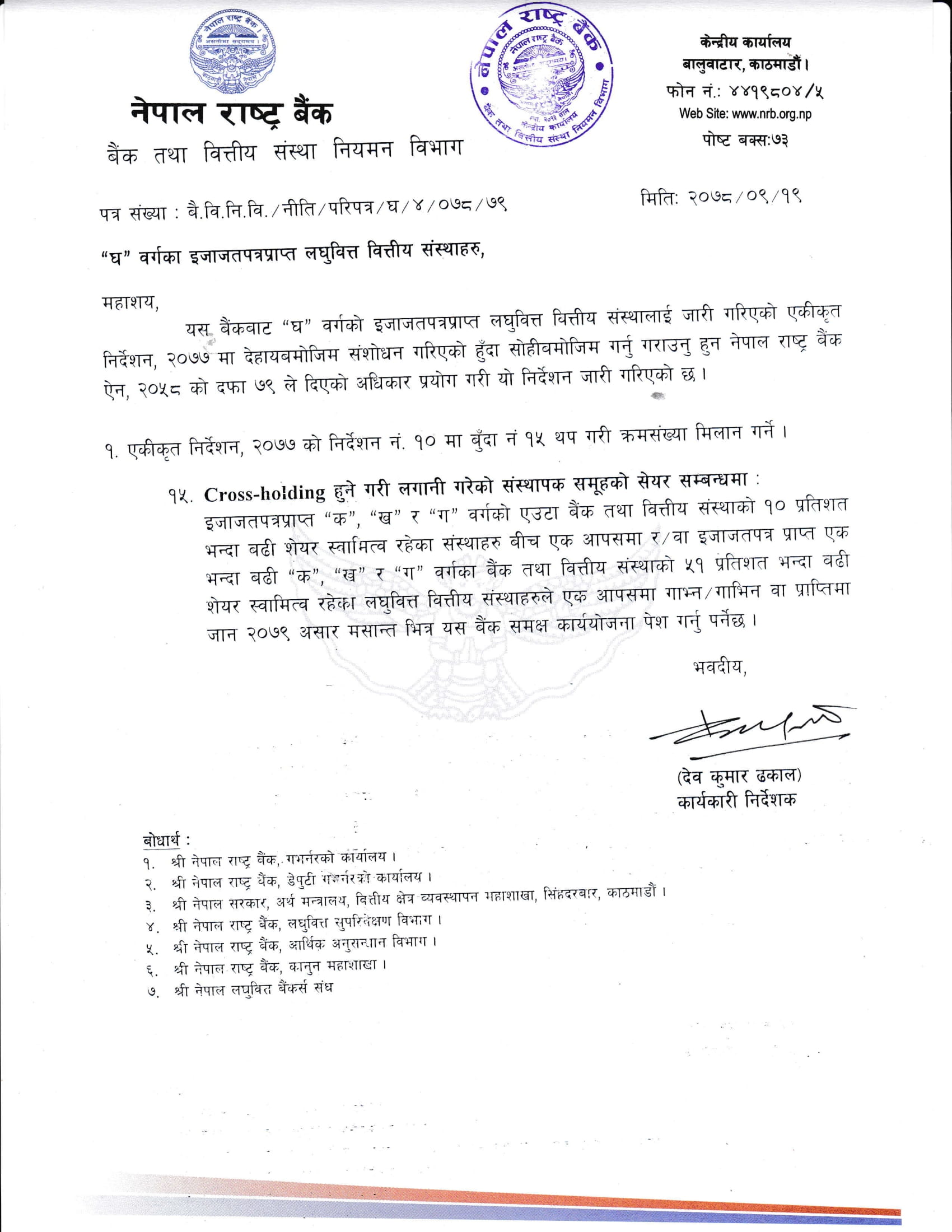 नेपाल राष्ट्र बैंकले बैंकबाट “घ“ वर्गको इजाजतपत्रप्राप्त लघुवित्त वित्तीय संस्थालाई जारी गरिएको एकीकृत निर्देशन, २०७७ मा संशोधन गर्दै इजाजतपत्रप्राप्त क, ख र ग वर्गको एउटा बैंक तथा वित्तीय संस्थाको १० प्रतिशत भन्दा बढी सेयर स्वामित्व रहेका संस्थाहरुबीच एक आपसमा वा इजाजतपत्र प्राप्त एक भन्दा बढी र ती बैंक तथा वित्तीय संस्थाको ५१ प्रतिशत भन्दा बढी सेयर स्वामित्व रहेका लघुवित्त वित्तीय संस्थाहरुलाई एक आपसमा गाभ्न/गाभिन वा प्राप्तिमा जान २०७९ असार मसान्त भित्र यस बैंक समक्ष कार्ययोजना पेश गर्न निर्देशन दिएको हो ।