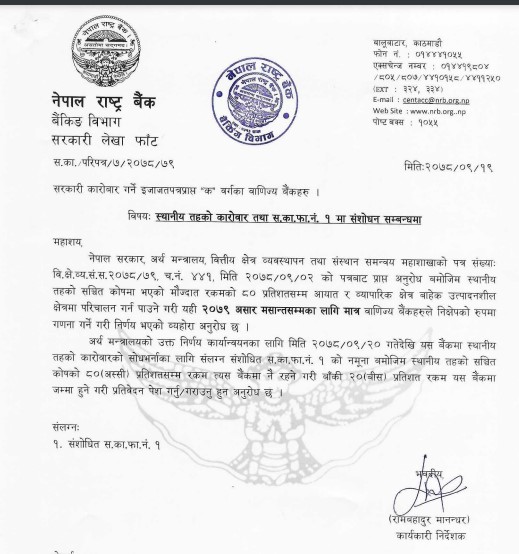 गत पुस २ गतेको अर्थ मन्त्रालयको वित्तीय क्षेत्र व्यवस्थापन तथा संस्थान समन्वय महाशाखाको पत्रबाट प्राप्त अनुरोधलाई कार्यान्वयन गर्दै राष्ट्र बैंकले स्थानीय तहको सञ्चित कोषमा भएको मौज्दात रकमको ८० प्रतिशतसम्म आयात र व्यापारिक क्षेत्रबाहेक उत्पादनशील क्षेत्रमा परिचालन गर्न पाउने गरी वाणिज्य बैंकहरुलाई निक्षेपका रुपमा गणना गर्न पाउने निर्णय गरेको हो। यो व्यवस्था २०७९ असार मसान्तसम्मका लागिमात्र हुने राष्ट्र बैंकले स्पष्ट पारेको छ।
