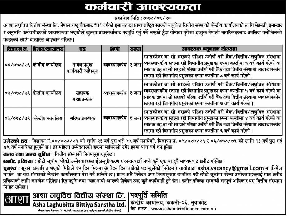 आशा लघुवित्तको केन्द्रीय कार्यालमा रोजगारीको अवसर, कति चाहिन्छ शैक्षिक योग्यता ?