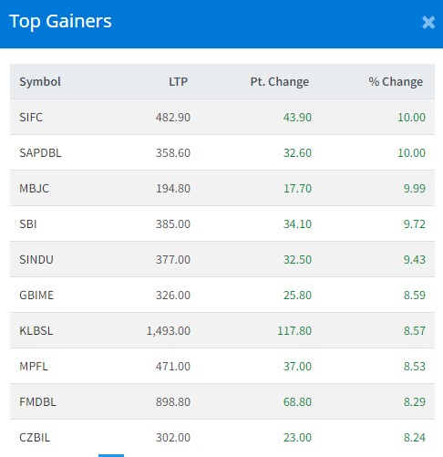 आज नेप्सेमा ६३ अंकको बृद्धि भई हरियाली छाउँदा ४ कम्पनीको शेयरमा सकारात्मक सर्किट लागेको छ । सर्किट लाग्ने कम्पनीहरुमा श्री इन्भेष्टमेन्ट फाइनान्स, सप्तकोशी डेभलपमेन्ट बैंक, मध्य भोटेकोशी जलविद्युत र नेपाल एसबिआइ बैंक रहेका छन् ।