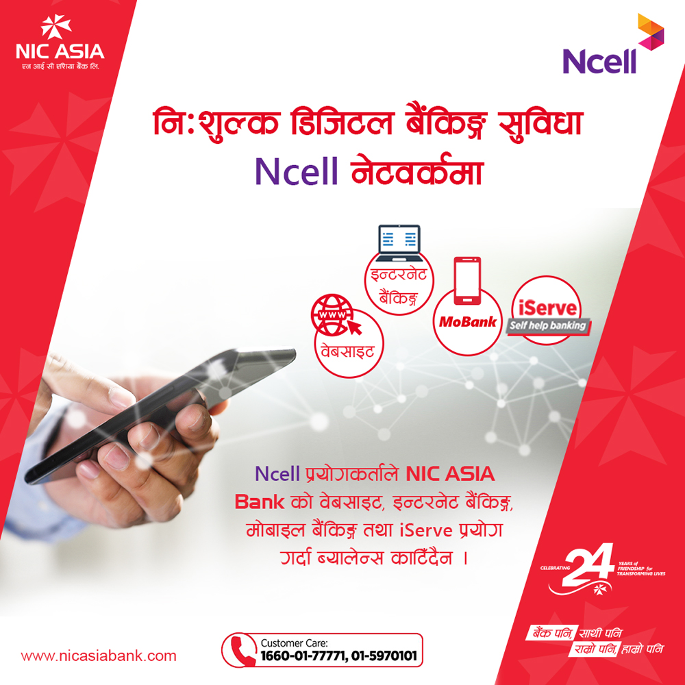 बृहत भौतिक शाखा सञ्जालका साथै आधुनिक डिजिटल च्यानलहरू मार्फत सहज, सबल, गतिशील, विश्वसनीय एवं उत्तरदायी बैंकिङ्गको नाता स्थापित गर्न सफल यस बैंकले ग्राहरूको सुविधा एवं डिजिटल बैंकिङ्गमा ग्राहकहरूलाई अभ्यस्त पार्ने उद्देश्यअनुरुप ल्याएको यस निःशुल्क एनआईसी एशिया मो.बैकिङ्ग, आइसर्भ, वेबसाइट तथा इन्टरनेट बैकिङ्गप्रयोग सुविधा एनसेलका ग्राहकहरूलाई उपलब्ध हुने बैंकले जनाएको छ ।