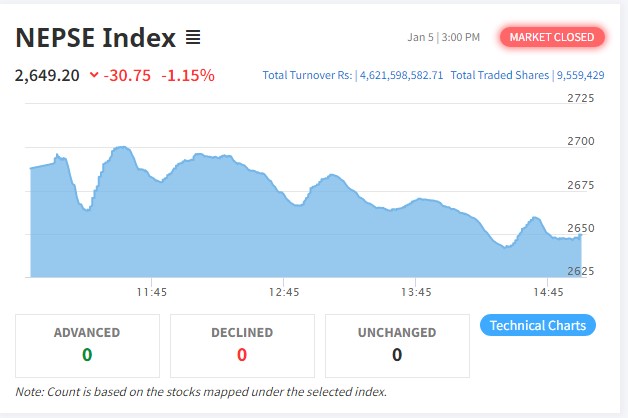 आज नेप्से परिसूचक ३० अंक अर्थात् १.१५ प्रतिशतले घटेर २६४९.२० विन्दुमा कायम भएको छ । सूचिकृत २३६ कम्पनीको ९५ लाख ५९ हजार ४२९ कित्ता शेयर किनबेच हुँदा ४ अर्ब ६२ करोड १५ लाख ९८ हजार ५८२ रुपैयाँको कारोबार भएको छ ।