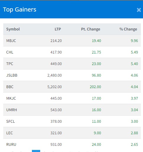 त्यस्तै, छाङ्दी हाइड्रोपावरको ५.४९ प्रतिशत, तेह्रथुम पावरको ५.४० प्रतिशत, जनउत्थान सामुदायिक लघुवित्तको ४.०६ प्रतिशत, बिशाल बजारको ४.०४ प्रतिशत, मैलुङ खोला जदविद्युतको ३.९७ प्रतिशत, यूनाइटेड आइडिआइ र्माेदी आरबि हाइड्रोपावरको ३.०४ प्रतिशत र समृद्धि फाइनान्सको ३ प्रतिशतले वृद्धि भएको हो ।