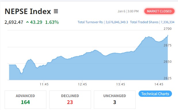 काठमाडौं । साता कारोबारको अन्तिम दिन नेप्समा पुनः हरियाली छाएको छ । निरन्तर उकालोतर्फ लागेको नेप्सेमा अघिल्लो दिन बुधबार ३० अंकको गिरावट आएको थियो । आज पुनः नेप्से ४३.२९ अंक अर्थात् १.६३ प्रतिशतले बृद्धि हुन पुगेको छ ।