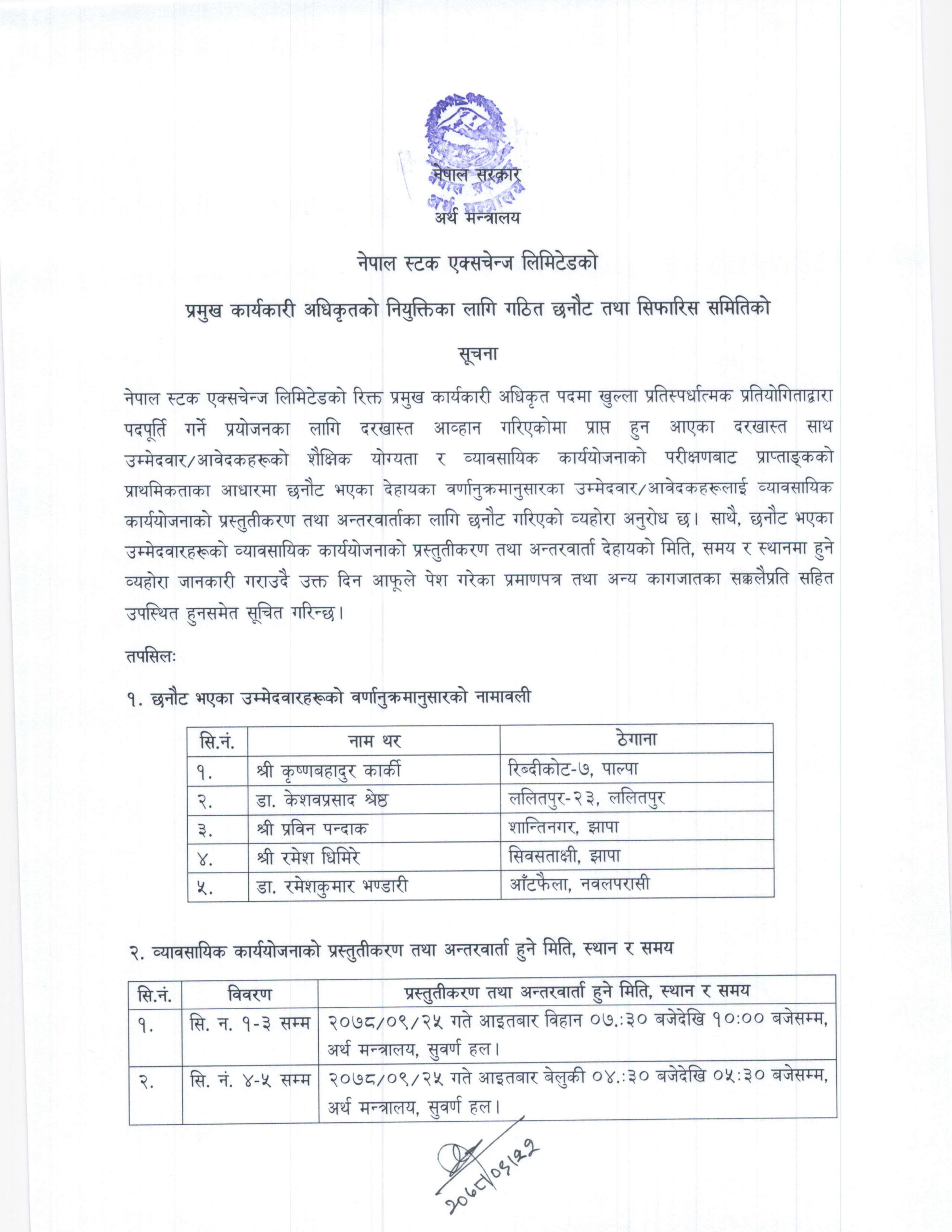 अन्तर्वार्ताका लागि छनौट भएकाहरुमा कृष्णबहादुर कार्की, केशवप्रसाद श्रेष्ठ, प्रविन पन्दाक, रमेश घिमिरे र रमेशकुमार भण्डारी हुन् ।