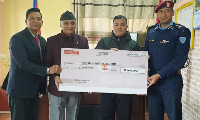 काठमाडौं । एभरेष्ट बैकले सिसिटिभि जडान समिति भक्तपुरलाई आर्थिक सहयोग गरको छ । शान्ति सुब्यवस्था चुस्त दुरुस्त तथा प्रविधिमैत्री बनाउने उद्देश्यले गठित भक्तपुर सिसिटिभि समितिलाई बैंकले १ लाख रकम सहयोग गरेको हो ।