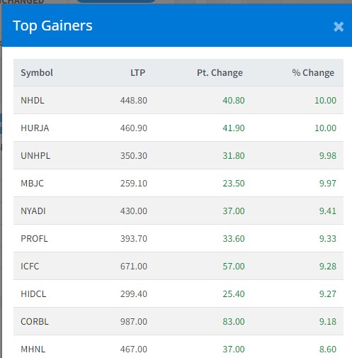त्यस्तै, न्यादी हाइड्रोपावरको ९.४१ प्रतिशत, प्रोगेसेभ फाइनान्सको ९.३३ प्रतिशत, आइसीएफसी फाइनान्सको ९.२८ प्रतिशत, हाइट्रोइलेक्सीटी इन्भेष्टमेन्टको ९.२७ प्रतिशत र कर्पोरेट डेभलपमेन्ट बैंकको ९.१८ प्रतिशतले वृद्धि भएको छ ।