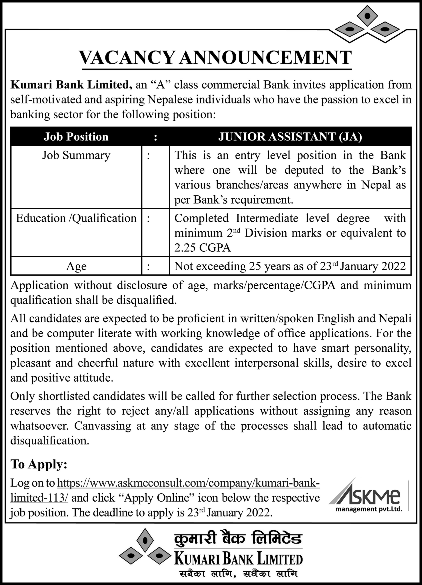 काठमाडौं । कुमारी बैंक लिमिटेडले कर्मचारी माग गरेको छ । बैंकले जुनियर एसिस्टेन्ट पदमा केही संख्यामा कर्मचारी माग गरेको हो ।२५ वर्ष नपुगेका न्युनतम कक्षा १२ मा दोस्रो श्रेडी वा २.२५ जिपीए प्राप्त इच्छुक ब्यक्तिले माघ ९ गतेसम्म कम्पनीको वेवसाइट मार्फत आवेदन दिन सकिनेछ ।