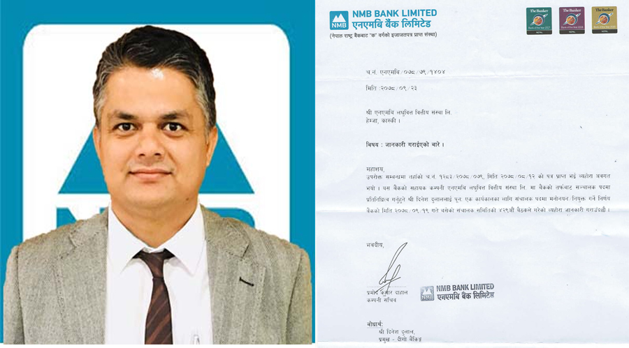 काठमाडौं । एनएमबि लघुवित्त वित्तीय संस्था लिमिटेडले संचालक दिनेश दुलाललाई पुन नियुक्त गरेको छ ।