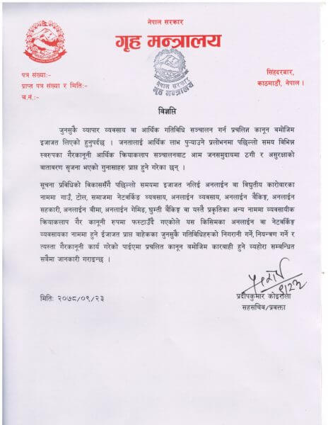 गृह मन्त्रालयले पछिल्लो समय इजाजत नै नलिई अनलाई वा विधुतीय कारोबारको नाममा नेटवकिङ विजनेनसको नाममा बिना इजाजत अनलाईन बीमा, अनलाईन बैंकिङ्, अनलाईन सहकारी, घुम्ती बैंकिङ् वा यस्तै प्रकृतिका अन्य नाममा व्यवसायिक क्रियाकलाप गैर कानुनी रुपमा फस्टाउदै गएको हुँदा इजजात पाप्त संस्था बाहेक अन्यले यस्तो गरेको पाईएमा कार्बाहि गर्ने भएको हो ।