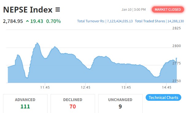 नेप्से १९ दशमलव ४३ अंकले बढ्दा २७८४ दशमलव ९५ को विन्दुमा कायम भएको छ। सूचीकृत २३६ कम्पनीको १ करोड ४२ लाख ८८ हजार १ सय ३० कित्ता शेयर खरिद बिक्रि हुँदा ७ अर्ब १२ करोड रुपैयाँ बराबरको शेयर कारोबार भएको छ।
