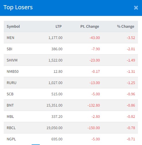 त्यस्तै, नेपाल एसबिआइ बैंकको २.०१ प्रतिशत, शिवम् सिमेन्टको १.४९ प्रतिशत, एनएमबि ५० को १.३१ प्रतिशत र रुरु जलविद्युतको १.२५ प्रतिशतले घटेको हो ।
