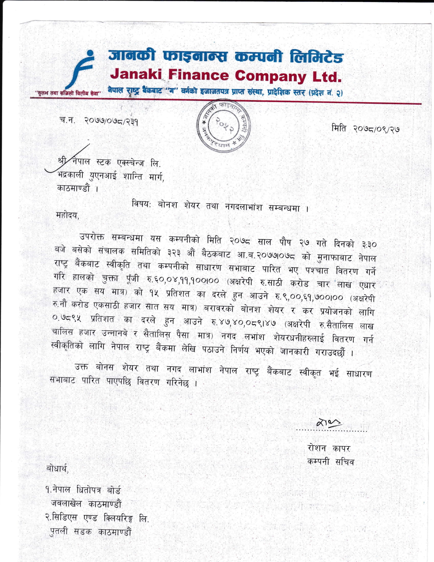 जानकी फाइनान्स कम्पनीले गर्यो लाभांश घोषणा