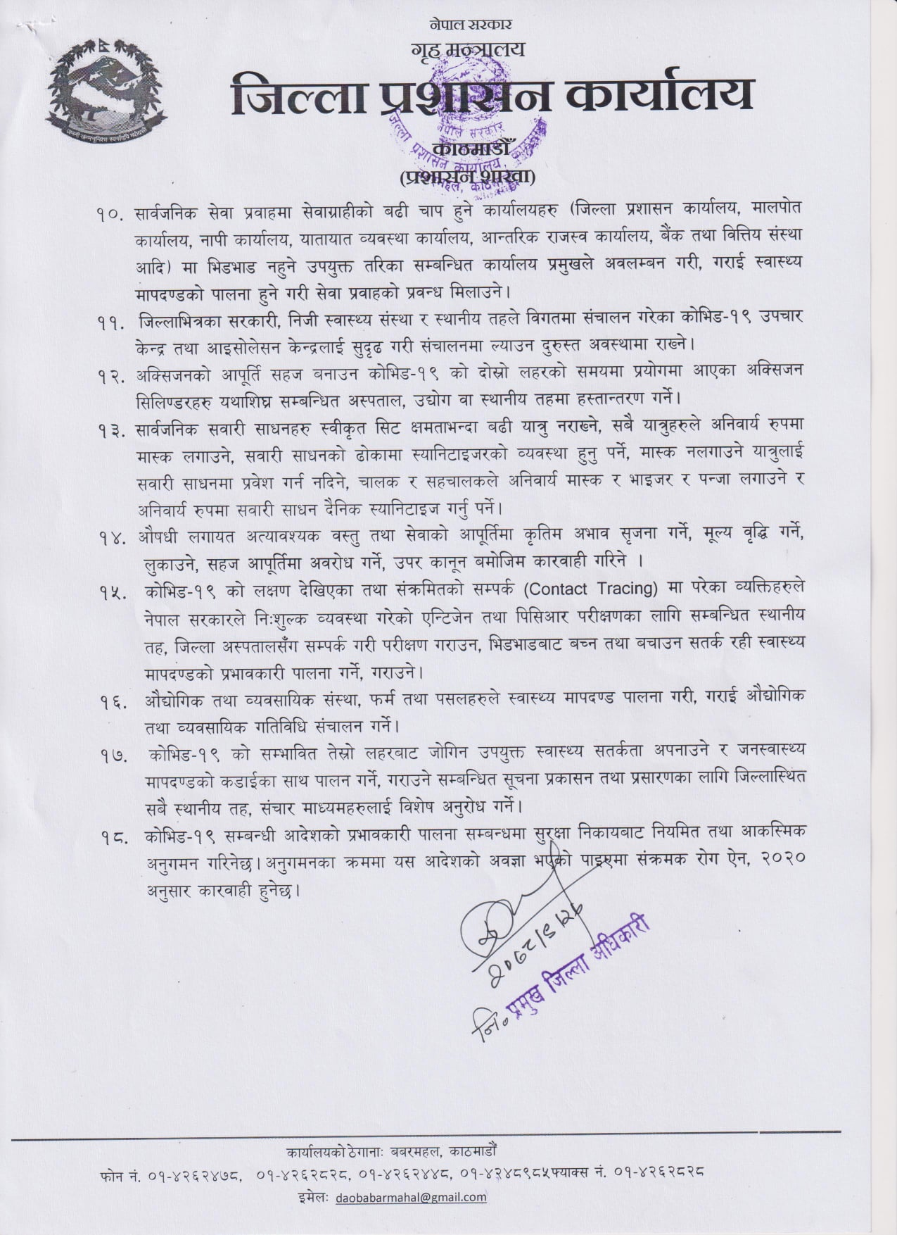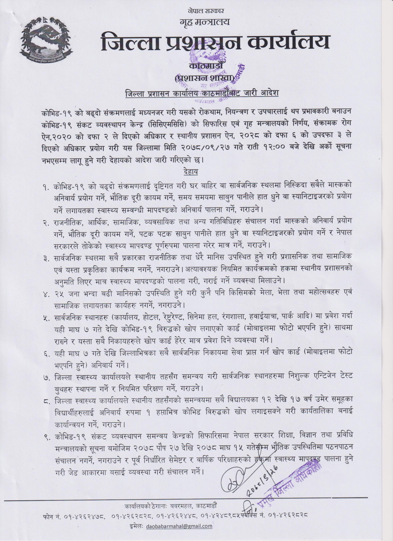 काठमार्डौं । पछिल्लो समय दिनप्रति दिन कोरोना संक्रमितको संख्या वृद्धि भइरहदाँ काठमाडौं उपत्यकामा मात्र ५० प्रतिशत भन्दा बढी संक्रमित देखिन थालेका छन् । सोही अवस्थालाई मध्यजनगर गर्दै काठमाडौं जिल्ला प्रशासन कार्यालयले एक विज्ञप्ति जारी गर्दै विभिन्न प्राबधानहरुमा कडाईका साथै प्रतिबन्ध लगाएको छ ।