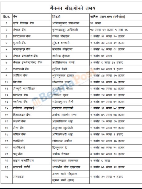 कुन बैंकका सिइओले एक बर्षमा कति लिए तलब सुविधा? एभरेष्ट र प्रभु बैंक सबैभन्दा अगाडि, सरकारी बैंकको कम