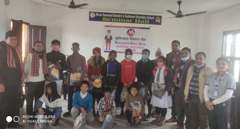काठमाडौं । मुक्तिनाथ विकास बैंक लिमिटेडले विद्यार्थीहरुलाई न्यानो पोशाक वितरण गरेको छ । बैंकको गिरुवारी शाखाले सामाजिक उत्तरदायित्व कार्यक्रमअन्तर्गत १५ जना विद्यार्थीलाई न्यानो कपडा वितरण गरेको हो ।