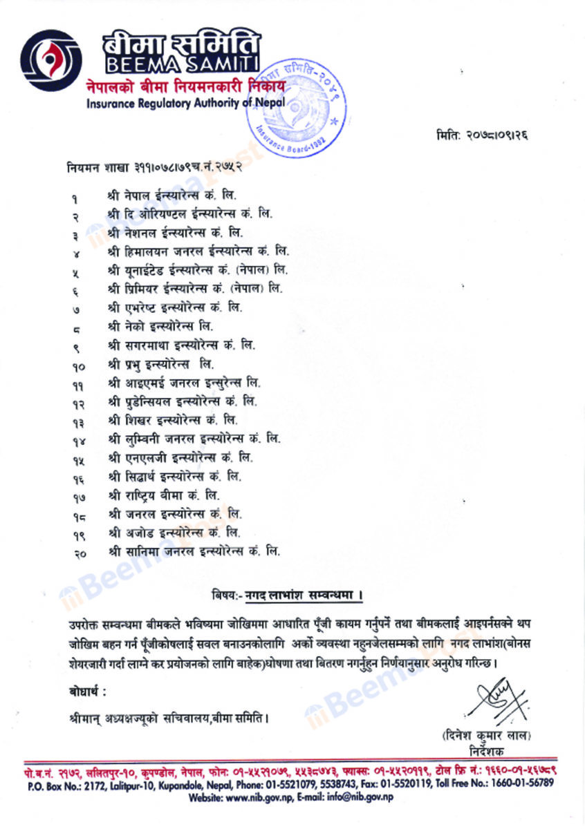 बीमा समितिद्धारा निर्जिवन बीमा कम्पनीहरुलाई नगद लाभांश वितरण नगर्न लिखित पत्रचार