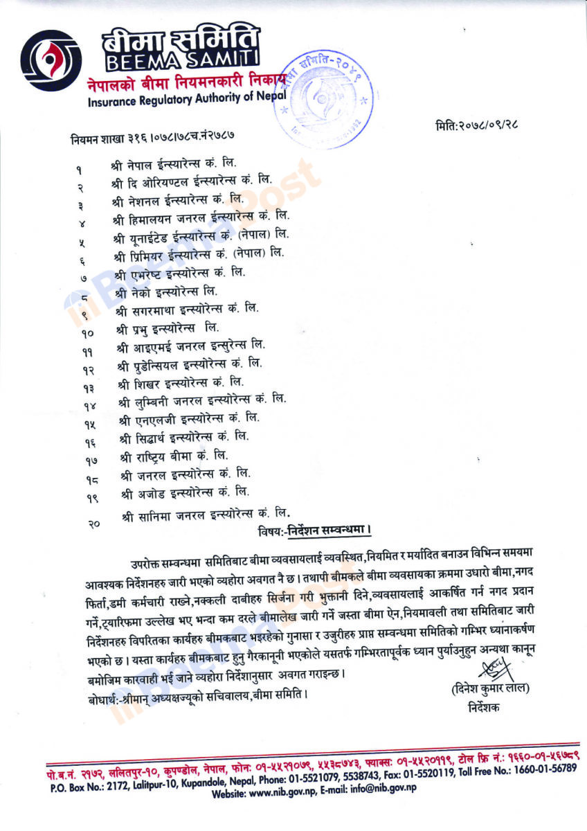 काठमाडौं । बीमा समितिले नेपालमा सञ्चालित २० वटै निर्जिवन बीमा कम्पनीलाई आज कडा निर्देशन जारी गरेको छ । समितिका नियमन शाखाका निर्देशक दिनेशलाल कर्णले आज सबै बीमा कम्पनीहरुलाई निर्देशन जारी गर्दै नक्कली दावीहरु सिर्जना गरी भुक्तानी दिने कार्य रोक्न निर्देशन दिएका छन् ।