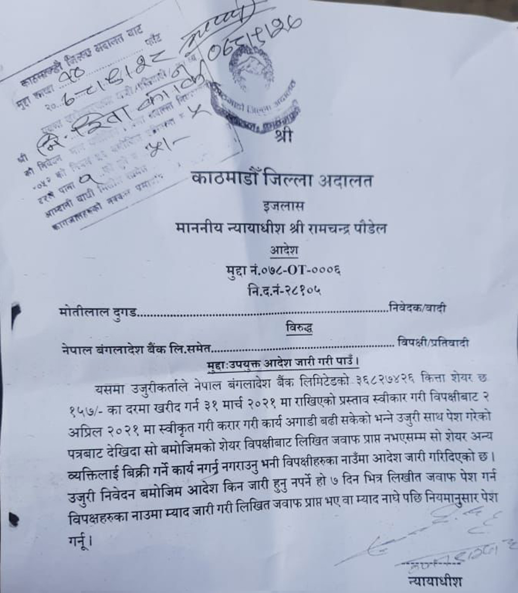 काठमाडौं । बुधबार उत्तर कोरियाली नेता किम जोङ उनले हाईपर सोनिक क्षेप्यास्त्रको परिक्षण गरे, जसको तरंग विश्वभर फैलिएको छ । बुधबार उत्तरकोरियाले परिक्षण गरेको हाईपर सोनिक मिलाईसकै शैलीमा अदालतबाट अन्तरिम आदेश भई मुद्दा प्रक्रियामा रहेको नेपाल बंगलादेश बैंक र नबिल बैंकको मर्जर प्रक्रियाका सम्बन्धमा निर्णयहरु गरेर नेपाल राष्ट्र बैंकमा बुझाइएको छ । बिनोद चौधरीको डिजाइनमा द्रुत गतिमा राष्ट्र बैंकमा मर्जर सम्बन्धी फाइल बुझाइए पनि बुधबार नै काठमाडौं जिल्ला अदालतबाट शेयर खरिद बिक्री सम्बन्धी कार्य तत्काल रोक्न अन्तरिम आदेश दिएसँगै अब दुई बैंकबीचको मर्जर प्रक्रिया समेत अबरुद्ध हुने भएको छ ।