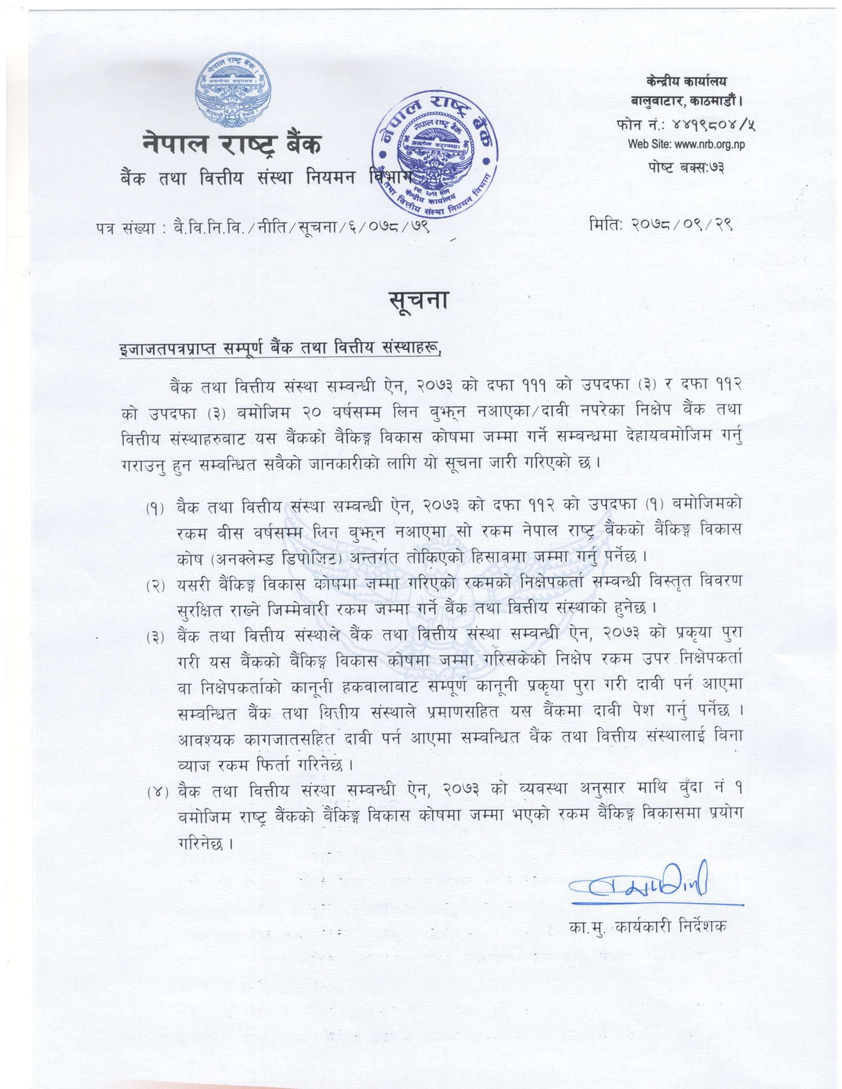 बैंक तथा वित्तीय संस्था सम्बन्धी ऐन, २०७३ को दफा ११२ को उपदफा (१) बमोजिमको रकम बीस वर्षसम्म लिन बुझ्न नआएमा सो रकम नेपाल राष्ट्र बैंकको बैंकिङ्ग विकास कोष (अनक्लेम्ड डिपोजिट) अन्तर्गत तोकिएको हिसावमा जम्मा गर्नुपर्ने राष्ट्र बैंकले जनाएको छ ।