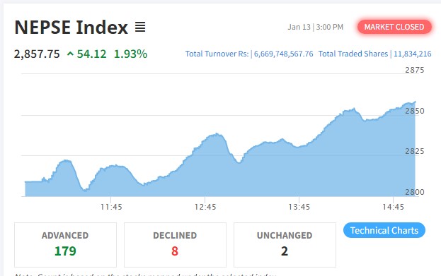 नेप्से परिसूचक १.९३ प्रतिशतले बृद्धि भएर २८५७.७५ विन्दुमा कायम भएको छ ।