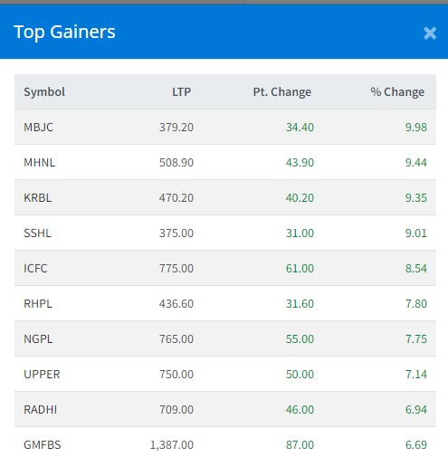 आज नेप्से उच्च अकंले वृद्धि हुदाँ भोटेकोशीको शेयरमा मात्र सर्किट लागेको हो । त्यस्तै, माउन्टेन हाईड्रो नेपालको ९.४४ प्रतिशत, कर्णाली डेभलपमेन्ट बैंकको ९.३५ प्रतिशत, शिव श्री हाइड्रोपावरको ९.०१ प्रतिशत, आइसीएफसी फाइनान्सको ८.५४ प्रतिशत र रसुवागढी हाइड्रोपावरको ७.८० प्रतिशतले वृद्धि भएको हो ।