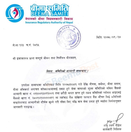 बीमा समितिको शुल्क र धरौटी दाखिलाका लागि दुई खाता, शुल्क नबिल बैंक र धरौटी ग्लोबल आईएमई बैंकमा बुझाउन निर्देशन
