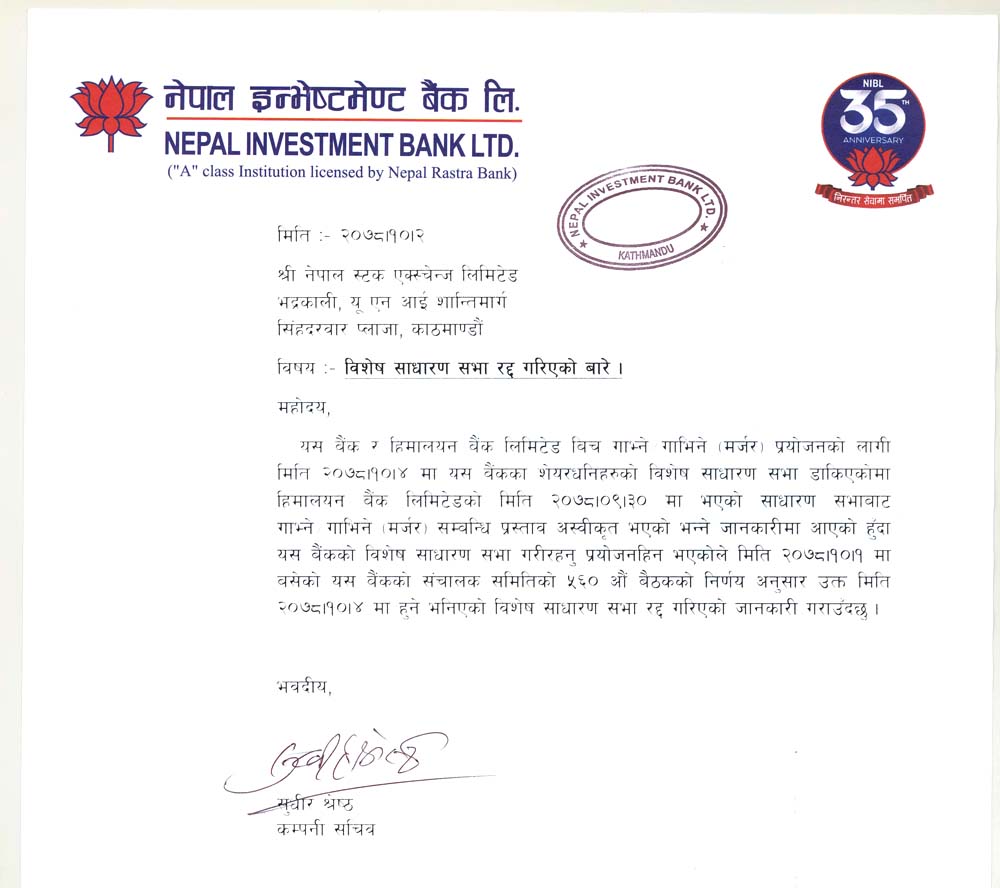 हिमालयन बैंकको पुष ३० गते भएको साधारण सभाबाट मर्जर सम्बन्धि प्रस्ताव अस्वीकृत भएपश्चात् इन्भेष्टेमेन्ट बैंकले माघ ४ मा बस्ने विशेष साधारण सभाको औचित्य नहुने भन्दै उक्त सभा रद्द गरेको हो ।