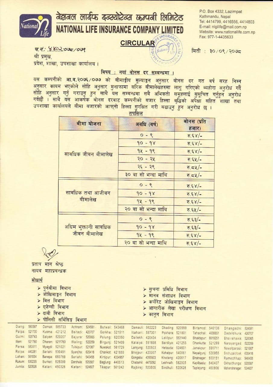 नेशनल लाइफ इन्स्योरेन्सको नयाँ बोनसदर सार्वजनिक, अधिकतम ८५ रुपैयाँसम्म बोनसदर निर्धारण