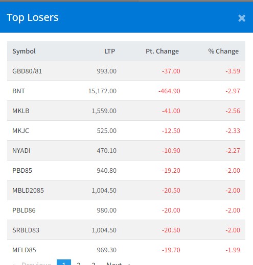 त्यस्तै, बोट्लस नेपालको २.९७ प्रतिशत, मनकामना स्मार्ट लघुवित्तको २.५६ प्रतिशत, मैलुङ खोला जलविद्युतको २.३३ प्रतिशत, न्यादी हाइड्रोपावरको २.२७ प्रतिशत र प्राइम डिबेञ्चरको २ प्रतिशतले घटेको हो ।