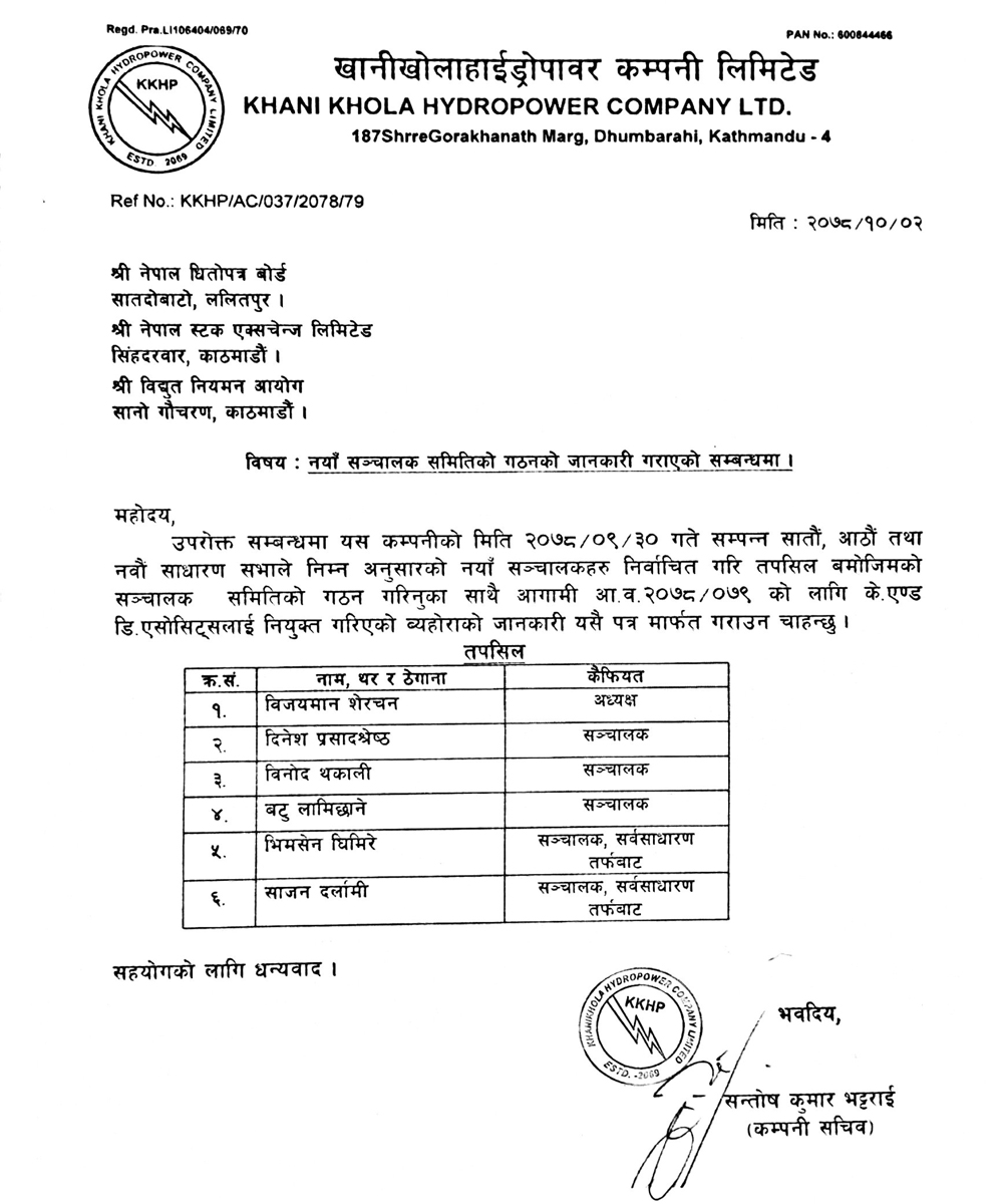 खानीखोला हाइड्रोपावरको नयाँ संचालक समिति गठन, अध्यक्षमा विजयमान शेयरचन