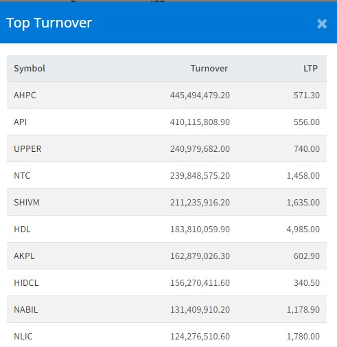 त्यस्तै, अपि पावर कम्पनीको ४१ करोड १ लाख, अपर तामाकोशीको २४ करोड ९ लाख, एनटिसीको २३ करोड ९८ लाख र शिवम् सिमेन्ट्सको २१ करोड १२ लाख भन्दा माथिको कारोबार भएको छ ।