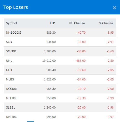 त्यस्तै, स्टान्डर्ड चार्टड बैंकको २.९१ प्रतिशत, समिट लघुवित्तको २.६९ प्रतिशत, यूनिलिभर नेपालको २.५० प्रतिशत, ग्रिन लाइफ हाइड्रोपावरको २.०५ प्रतिशत र मानुषि लघुवित्तको २.०५ प्रतिशतले घटेको हो ।