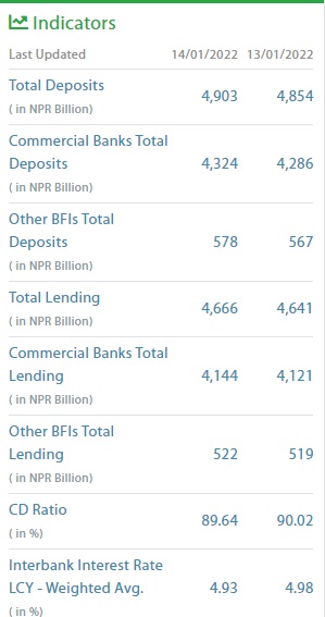 योसँगै बैंकहरुको कुल निक्षेप ४९ खर्ब ३ अर्ब रुपैयाँ पुगेको छ। गत पुस २९ गतेसम्म कुल निक्षेप ४८ खर्ब ५४ अर्ब रुपैयाँ रहेको थियो।