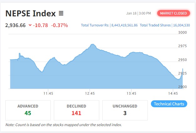 नेप्से परिसूचक आज १० दशमलव ७८ अंकले घटेर २९३६ दशमलव ६६ विन्दुमा कायम भएको छ । देश आर्थिक संकटको अवस्थामा रहेको शेयर बजार अर्थात् पूँजीकरण लगातार जिडिपी भन्दा माथि बढ्नुले जोखिम हुन सक्ने शेयर बजार विश्लेषकहरुले अनुमान लगाएका थिए ।