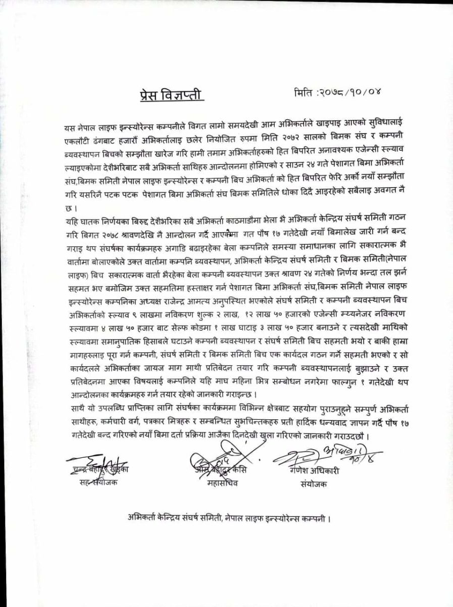नेपाल लाइफले गत साउन २४ गते बीमा अभिकर्ताको एजेन्सी स्ल्याव परिवर्तन गरेको थियो । गणेश अधिकारीको नेतृत्वमा बीमा अभिकर्ता केन्द्रीय संघर्ष समिति बनाएर नेपाल लाइफमा सुधारको माग सहित आन्दोलन आज सहमतीका बीचमा टुंगीएको हो ।