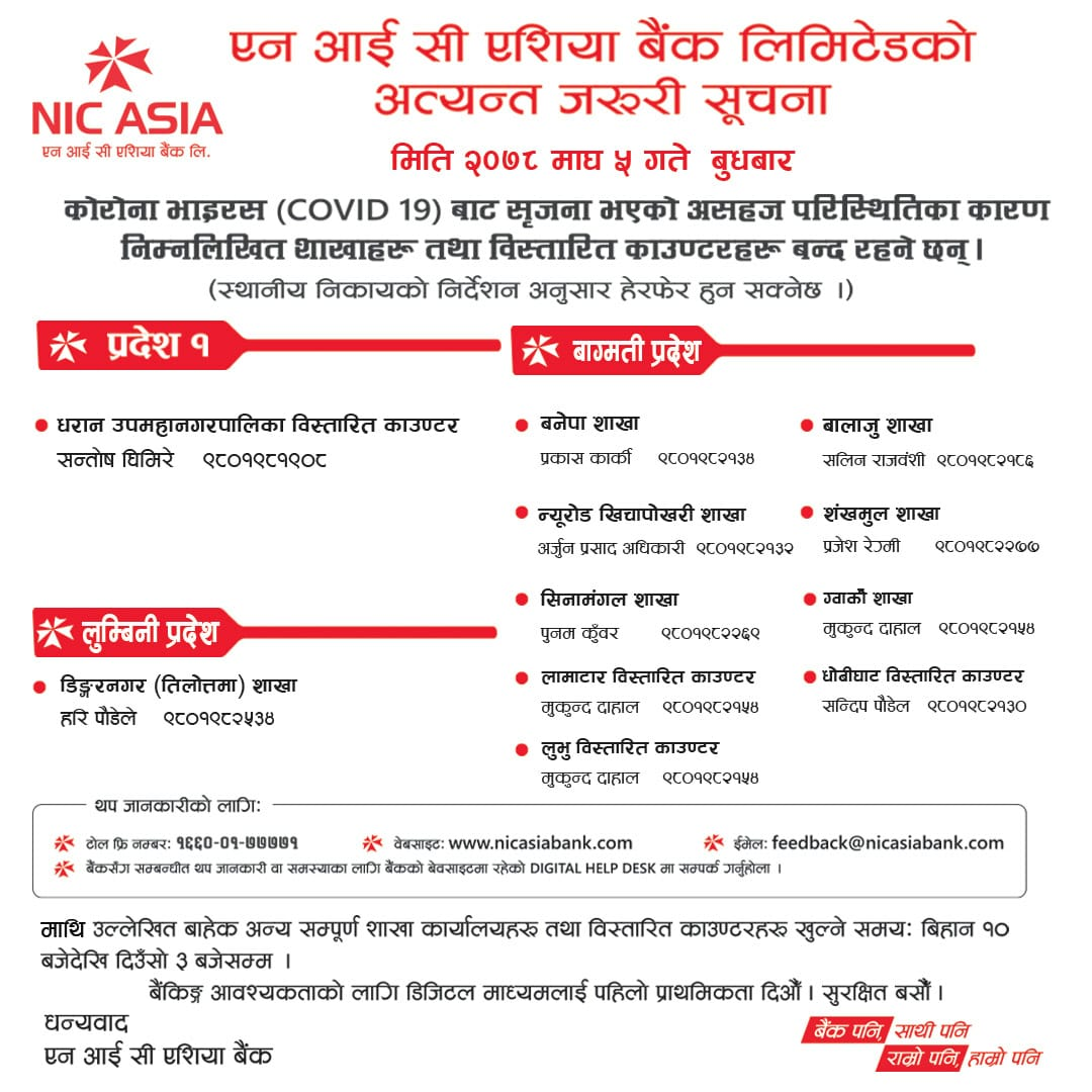 काठमाडौं । कोरोना भाइरसबाट सृजना भएको परिस्थितिले गर्दा एनआइसी एशिया बैंकका ११ शाखा तथा बिस्तारित काउण्टटरहरु बन्द गरिएका छन् ।