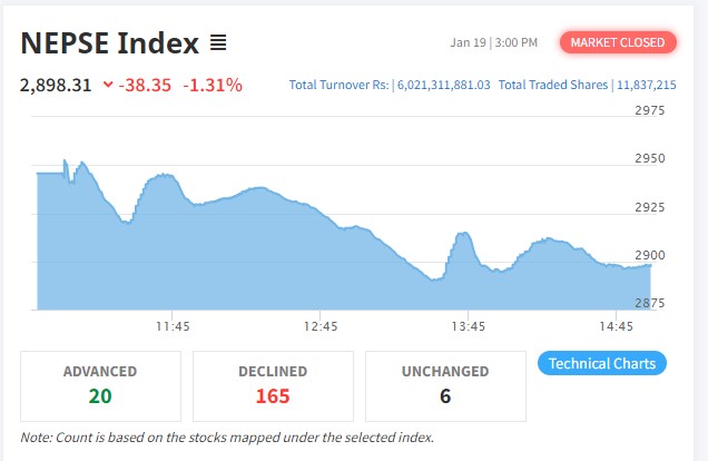 नेप्सेमा ३८ अंकको गिरावट आउँदा कारोबार ६ अर्बमा खुम्चियो