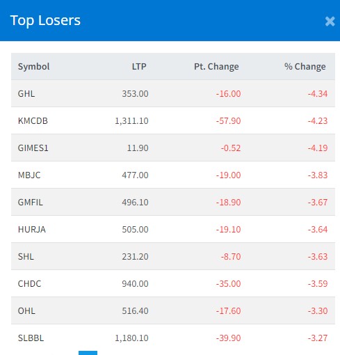 त्यस्तै, कालिका लघुवित्तको ४.२३ प्रतिशत, ग्लोबल आइएमई समुन्नती स्कीमको ४.१९ प्रतिशत, मध्य भोटेकोशी जलविद्युतको ३.८३ प्रतिशत र गुहेशोवरी मर्चेन्ट बैंकको ३.६७ प्रतिशतले घटेको हो ।