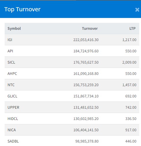 त्यस्तै अपि पावरको १८ करोड ४७ लाख, शिखर इन्स्योरेन्सको १७ करोड ६७ लाख, अरुण भ्याली हाइड्रोपावरको १६ करोड १० लाख र एनटिसिको १५ करोड ६७ लाख भन्दा माथिको कारोबार भएको छ ।