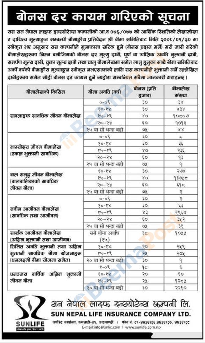 सन नेपाल लाइफको नयाँ बोनसदर सार्वजनिक, अधिकतम् ७५ रुपैयाँसम्म बोनस पाइने