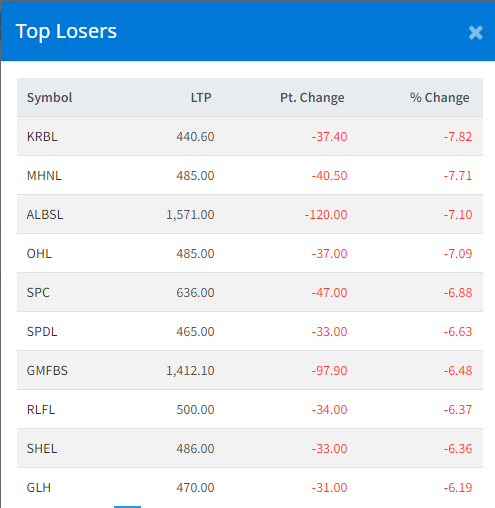 साथै अन्य सर्वाधिक गुमाउने कम्पनीहरुमा माउन्टेन हाइड्रो नेपालको ७.७१ प्रतिशत, आशा लघुवित्तको ७.१० प्रतिशत, ओरियन्ट होटलको ७.०९ प्रतिशत र सामलिङ पावरको ६.८८ प्रतिशतले घट्न पुगेको छ ।