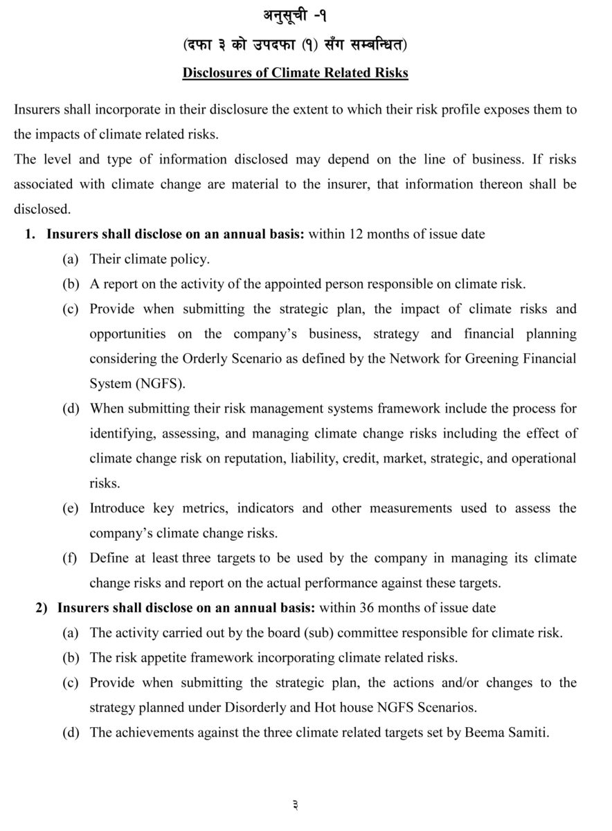 बीमा कम्पनीहरुले जलवायु सम्बन्धी जोखिमबाट आफ्नो व्यवसायमा परेको प्रभाव खुलाई अनुसूची–१ बमोजिमको विवरण आफ्नो वार्षिक प्रतिवेदनमा समावेश गर्नुपर्ने व्यवस्था नयाँ निर्देशिकामा छ । त्यस्तै निर्देशिकाको उपदफा २ मा उपदफा (१) बमोजिमको विवरण कुनै कारणले प्रकाशन नगरेमा बीमकले सोसम्बन्धी कुनै वैकल्पिक सूचना प्रकाशन गरेको छ वा छैन वा जलवायु जोखिम सम्बन्धी विवरण बीमकको पोर्टफोलियोसँग सान्दर्भिक भए वा नभएको वा त्यस्तो विवरण उपलब्ध हुन नसक्नाको कारण स्पष्ट खुलाउनुपर्नेछ ।
