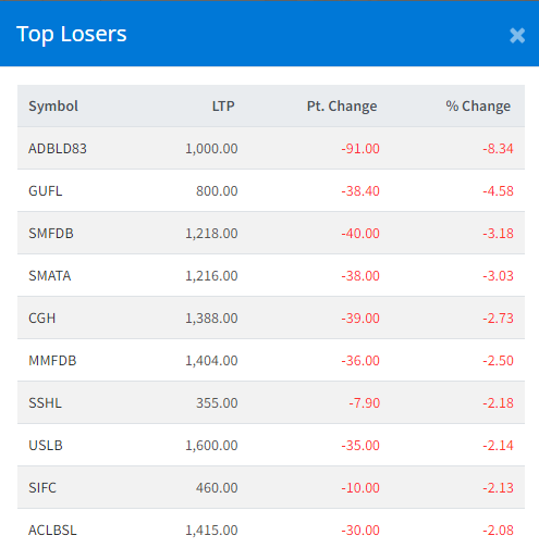 आज नेप्सेमा सामान्य अंकले घटेपनि केही कम्पनीको शेयरमूल्य उच्च घट्न पुगेको छ । सर्वाधिक गुमाउने कम्पनीमा कृषि विकास बैंकको डिबेञ्चर रहेको छ । डिबेञ्चरको आज ८.३४ प्रतिशतले घट्न पुगेको हो ।