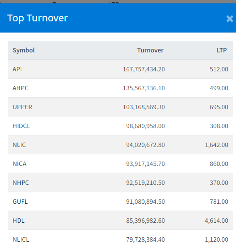 त्यस्तै, अरुण भ्याली हाइड्रोपावरको १३ करोड ५५ लाख, अपर तामाकोशीको १० करोड ३१ लाख, एचआइडिसिएलको ९ करोड ८६ लाख र नेपाल लाइफ इन्स्योरेन्सको ९ करोड ४० लाख भन्दा माथिको कारोबार भएको छ ।