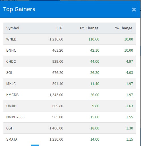 त्यस्तै, सिइडिबी हाइड्रोपावर डेभलपमेन्टको ४.९७ प्रतिशत, सानिमा जनरल इन्स्योरेन्सको ४.०३ प्रतिशत, मैलुङ खोला जलविद्युतको १.९७ प्रतिशत, कालिका लघुवित्तको १.९७ प्रतिशत, यूनाइटेड आइडिआइ मार्दी आरबि हाइड्रोपावरको १.६३ प्रतिशत र एनएमबि डिबेञ्चरको १.५५ प्रतिशतले बढेको हो ।