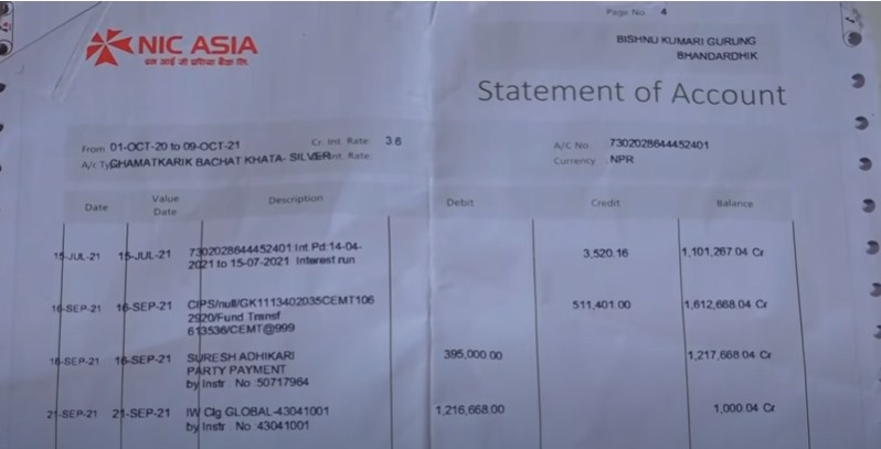 एनआईसी एसिया बैंकमा पैसा राखेकी ५३ बर्षिय गुरुङको खाताबाट चार लाख झिकियो, छानविन गर्नुको साटो सिईओले गरे कर्मचारीको सरुवा
