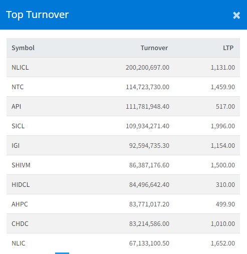 त्यस्तै, एनटिसीको ११ करोड ४७ लाख, अपि पावरको ११ करोड १७ लाख, शिखर इन्स्योरेन्सको १० करोड ९९ लाख र आइएमई जनरल इन्स्योरेन्सको ९ करोड २५ लाख भन्दा माथिको कारोबार भएको छ ।