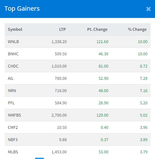 त्यस्तै, सिइडिबि हाइड्रोपावर डेभलपमेन्टको ८.७२ प्रतिशत, अजोड इन्स्योरेन्सको ७.२८ प्रतिशत, एनआरएन इन्फेक्चर एण्ड डेभलपमेन्टको ७.१६ प्रतिशत र पोखरा फाइनान्सको ५.२० प्रतिशतले बढेको हो ।