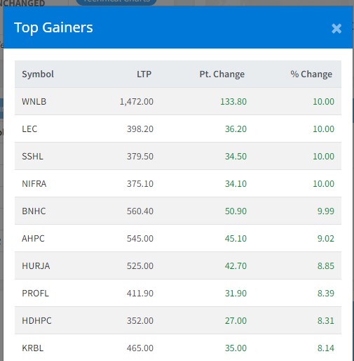 त्यस्तै, अरुण भ्यालि हाइड्रोपावरको ९.०२ प्रतिशत, हिमालयन उर्जा विकासको ८.८५ प्रतिशत, प्रोगेरेसिभ फाइनान्सको ८.३९ प्रतिशत र हिमाल दोलाखा हाइड्रोपावरको ८.३१ प्रतिशतले वृद्धि भएको हो ।